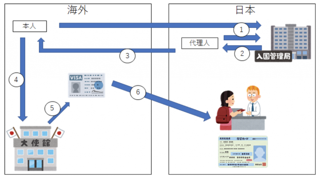 本人は、代理人から送付された在留資格認定証明書を持参して在外公館に行き、在留資格認定証明書を提示してビザの申請をします。